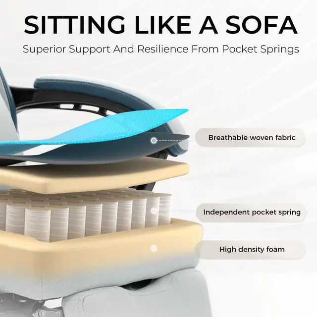 Dynamic Spring Comfort: The seat cushion is built with individually wrapped pocket springsjust like those in premium sofaseach one flexing independently to respond to your every move. This design evenly distributes pressure, providing a soft yet supportive feel that keeps you comfortably cradled, delivering the same plush, responsive comfort found in luxury gaming chairs.