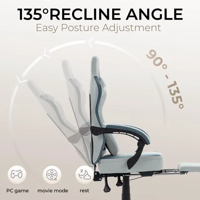 Effortless Adaptability: Whether youre locked in a gaming marathon or winding down for a quick nap, this chair adjusts effortlessly to your routine. The 135° reclining backrest and retractable footrest let you find your perfect angle, while the height-adjustable massage lumbar and head pillows melt away tension in your neck and spineoffering tailored comfort for both gamers and professionals who spend long hours seated.