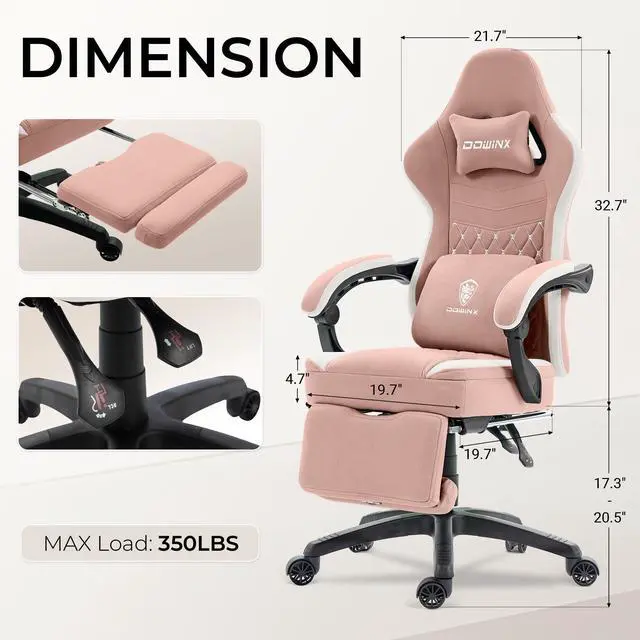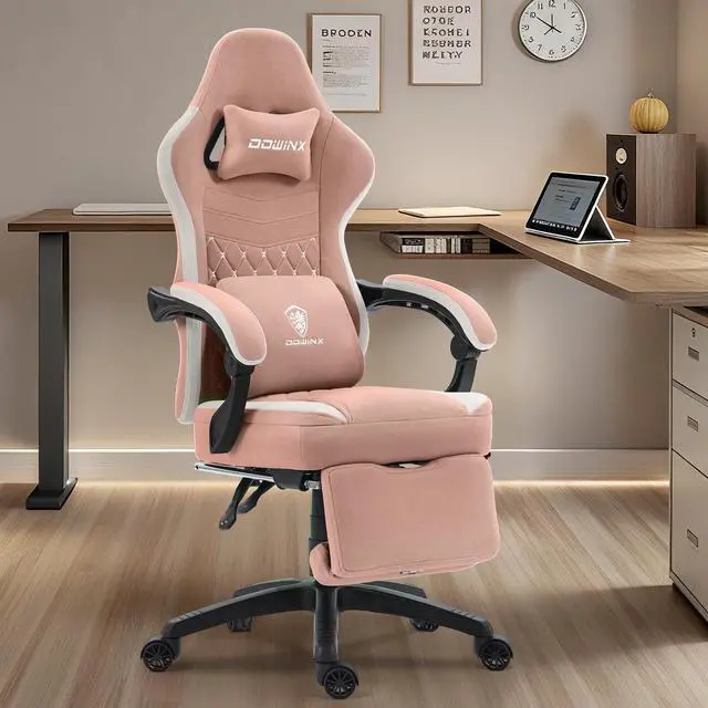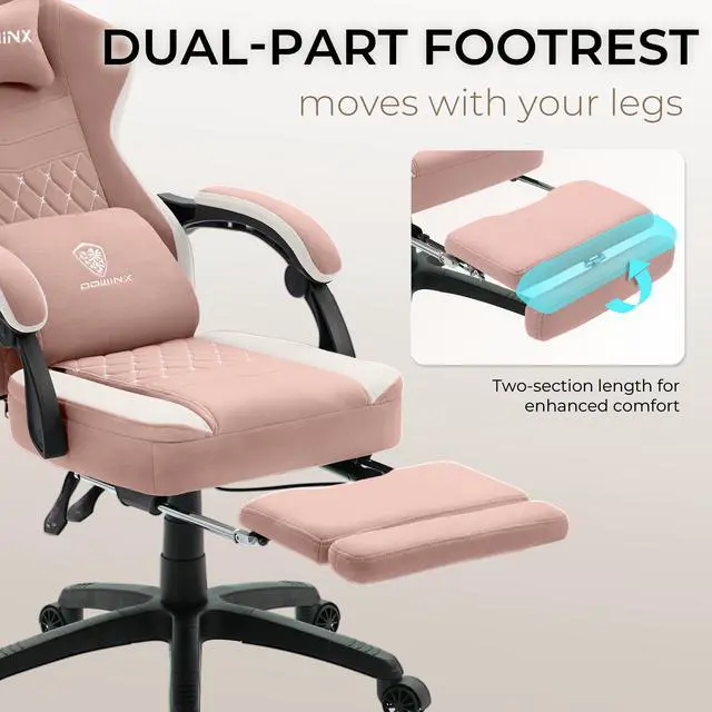Dowinx Gaming Chair with Footrest, Breathable Fabric Gamer Chair with Gel Pad and Storage Bag, Ergonomic Office Chair with Lumbar Support for Home Task, Pink
