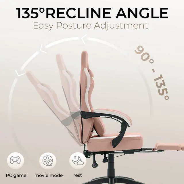 Effortless Adaptability: Whether youre locked in a gaming marathon or winding down for a quick nap, this chair adjusts effortlessly to your routine. The 135° reclining backrest and retractable footrest let you find your perfect angle, while the height-adjustable massage lumbar and head pillows melt away tension in your neck and spineoffering tailored comfort for both gamers and professionals who spend long hours seated.