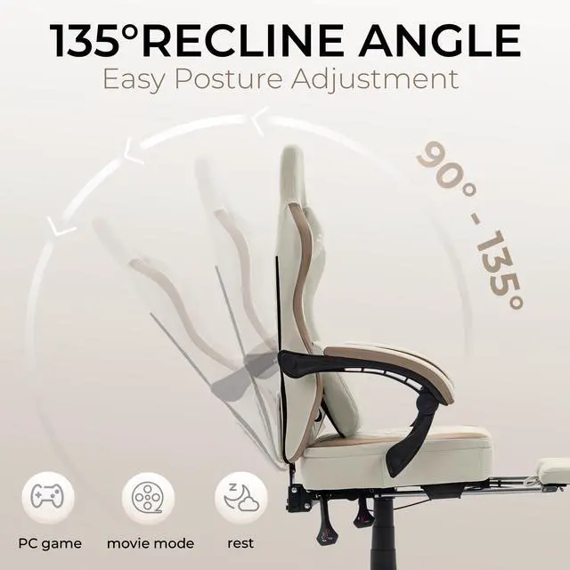 Effortless Adaptability: Whether youre locked in a gaming marathon or winding down for a quick nap, this chair adjusts effortlessly to your routine. The 135° reclining backrest and retractable footrest let you find your perfect angle, while the height-adjustable massage lumbar and head pillows melt away tension in your neck and spineoffering tailored comfort for both gamers and professionals who spend long hours seated.