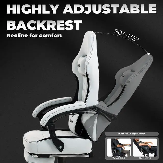 Adjustable Recline with Footrest: Switch easily from work to relaxation with this ergonomic gaming chair. The backrest reclines between 90° and 135°, while the retractable footrest lets you stretch out in comfort, offering versatility similar to premium reclining gaming chairs.