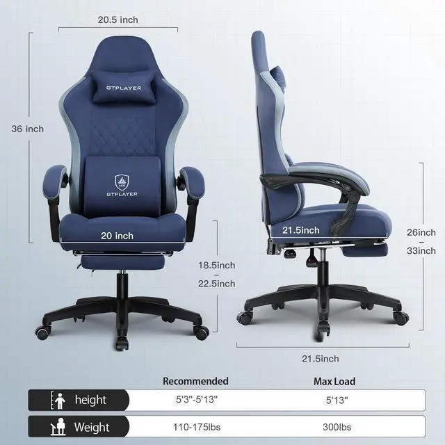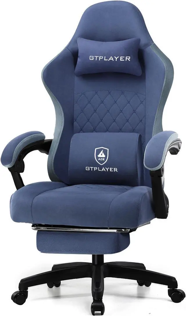 GTPLAYER Gaming Chair with Footrest Fabric Office Chair with Pocket Spring Cushion and Linkage Armrests, High Back Ergonomic Computer Chair with Lumbar Support Task Chair-Blue