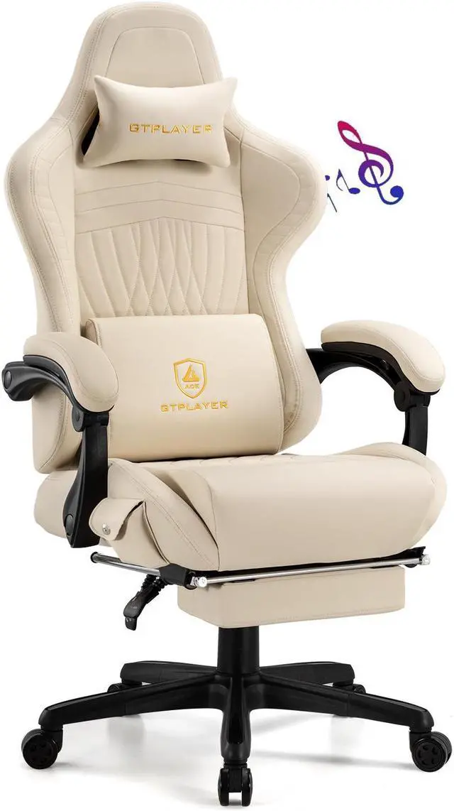 GTPLAYER Gaming Chair, Computer Chair with Footrest and Bluetooth Speakers, High Back Ergonomic Gaming Chair, Reclining Gaming Chair with Linkage Armrests for Adults Ivory
