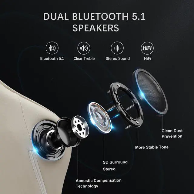 5.1 Compatible Bluetooth Gaming ChairOriginal designed with dual Bluetooth 5.1 speakers. The surround sound system brings out the best in your entertainment, delivering remarkable and richly detailed stereo sound out loud in solid bass and clear treble.