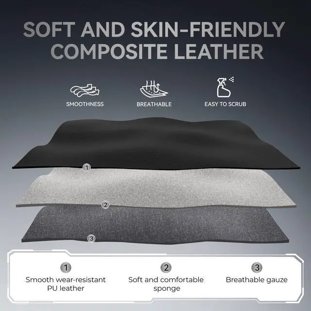 SELECTED MATERIALSCrafted from premium, multi-layer, wear-resistant PU leather with intricate embroidery, this gaming chair is stain-resistant and easy to clean. The high-quality molded sponge ensures long-lasting resilience, maintaining its shape even after prolonged use.