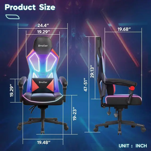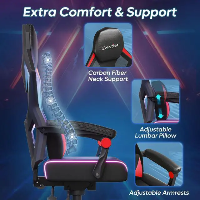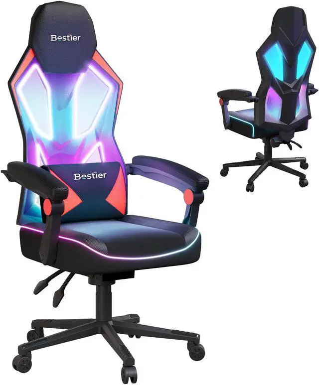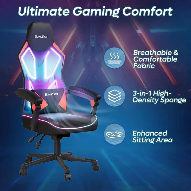 Bestier RGB LED Gaming Chair with Pocket Spring Cushion and Adjustable Lumbar Support, Ergonomic Breathable Fabric Computer Office Chair for Gaming Room, Study or Bedroom, Black/ Red