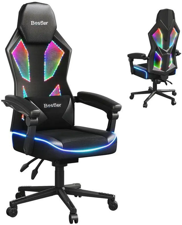 Transform your gaming and work environment with the Bestier Gaming Chair, a high-back ergonomic racer designed for maximum comfort and style. This computer PC office chair features adjustable lumbar support, allowing you to customize your seating position for optimal posture during long hours of gaming or work. The vibrant LED lights add a modern, dynamic flair to your setup, making it a standout piece in any room. Perfect for gamers and professionals alike, this chair combines sleek design with practical functionality, ensuring you stay comfortable and focused. Elevate your experience with the Bestier Gaming Chair today.