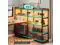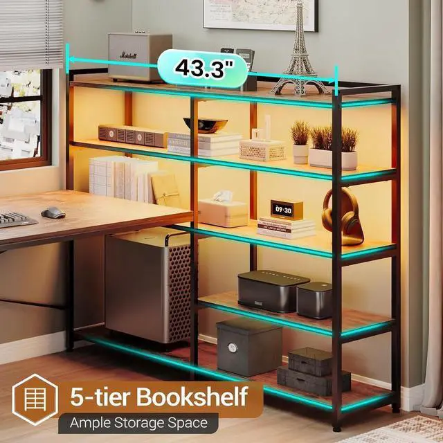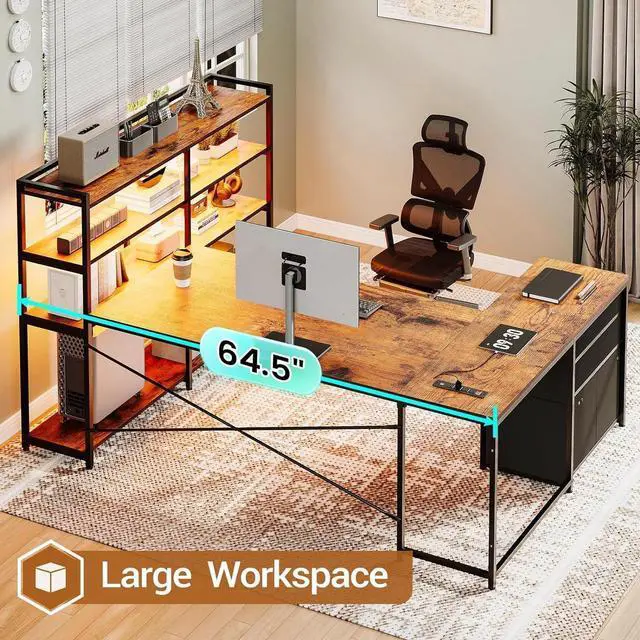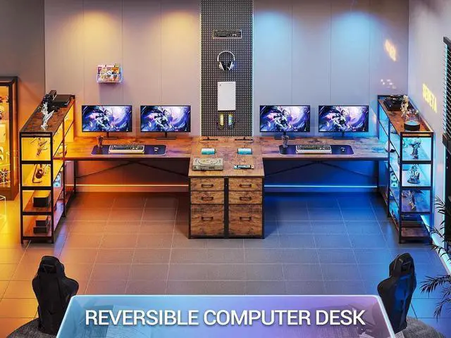 L shaped gaming desk comes with a power outlet, LED lights, storage shelves, fabric drawers, an computer desk that can hold 2 monitors, storage shelves, and a CPU stand. The gaming desk could hold 2 desktop computers and 1 notebook computer. An ideal desk for small rooms to create excellent home office space.