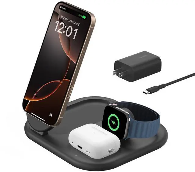 Charge your essentials with an ultra-convenient foldable stand. It delivers 15W of fast wireless charging to your iPhone 16/15/14/13/12, 5W to your Apple Watch and 5W to your AirPods. Leveraging MagSafe compatibility and Qi2 technology, you can place your iPhone on the charging pad for a secure, magnetic connection.