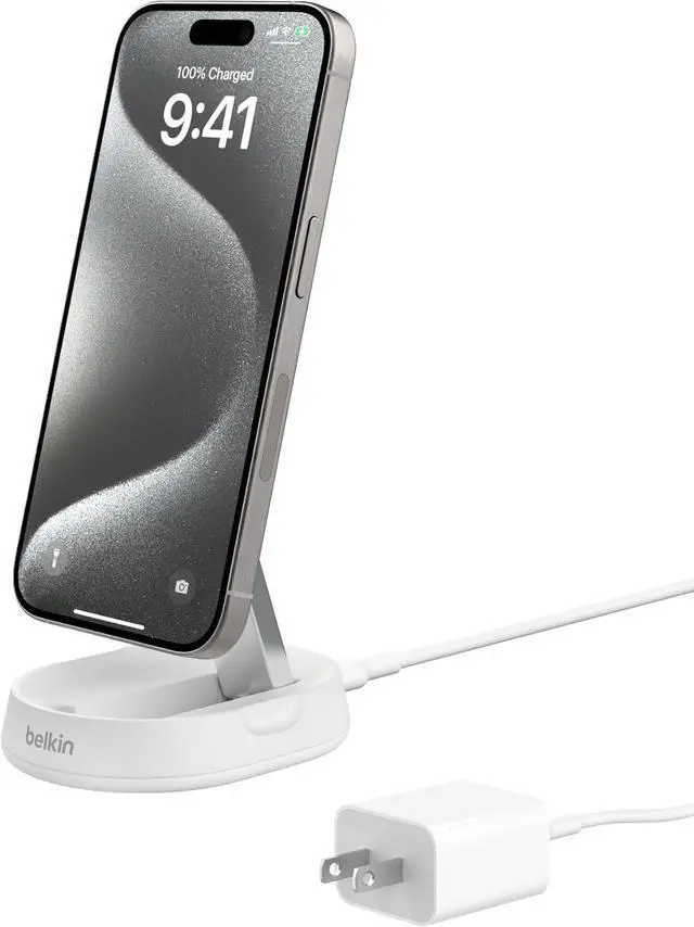 The Belkin BoostCharge Pro 15W Convertible Magnetic Charging Stand lets you fast charge your iPhone or Qi2 compatible device up to 15W with Qi2 technology that also optimizes energy usage and safeguards the device's battery life. MagSafe compatible, this stand tilts in pad or stand mode for easy and convenient viewing from various angles. And for Apple users, this magnetic charger is equipped with Standby Ready technology. Purchase yours with peace of mind, as it comes with a 2-year warranty and $2,500 Connected Equipment Warranty (CEW).