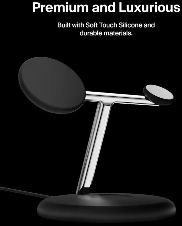 • Get ultra-convenient wireless charging with our MagSafe Compatible 3-in-1 Wireless Charging Stand with Magnetic Qi2. This wireless charging stand delivers 15W of lightning-fast charging your iPhone 16, 15, 14, or 13 and up to 5W for your AirPods and an additional 5W for your Apple Watch. Leveraging magnetic Qi2 technology, you can simply place your iPhone on the charging mount for a secure, aligned connection. And a built-in LED indicator light makes viewing your AirPods' or compatible Belkin earbuds' charge status as easy as ever. Purchase with peace of mind, as it comes with a 2-year warranty and $2,500 Connected Equipment Warranty (CEW).