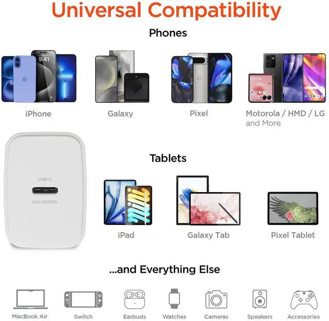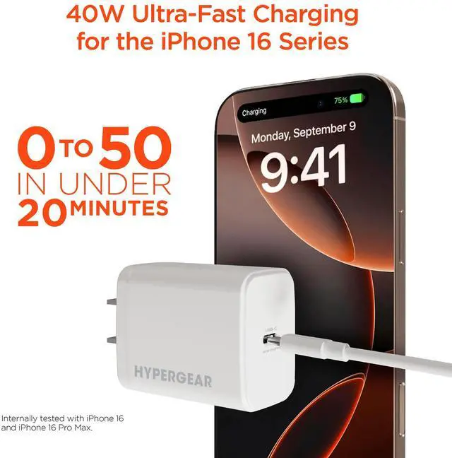 Power up like a pro with the SpeedBoost 40W GaN Fast Wall Charger. Engineered for the iPhone 16 Series, this compact yet powerful charger delivers up to 40W of USB-C Power Deliveryenough to turbocharge an iPhone 16 Pro Max from 0 to 50% in under 20 minutes! Cutting-edge gallium nitride (GaN) technology doubles the power of a standard fast charger while staying cool and ultra-compact. Whether at your desk or on the go, this space-saving powerhouse is all you need to fast charge your iPhone, iPad, and even your MacBook Air with a single device.