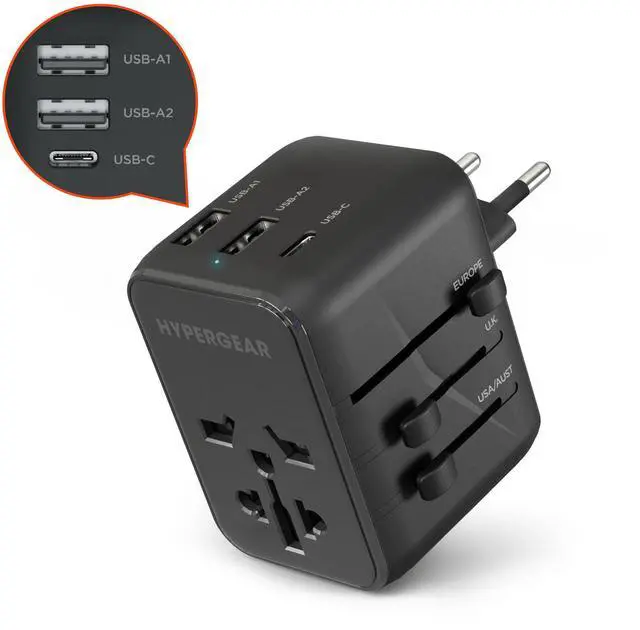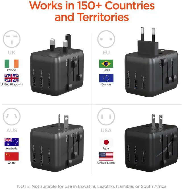Stay connected no matter where you are! Built to function in more than 150 countries, territories, and island regions, this 4-in-1 travel adapter integrates a 15W USB-C fast charge port, two high-speed USB-A ports, and a versatile AC socket into one compact, lightweight design thats easy to pack. Offering full international voltage compatibility and retractable prongs in 4 configurations, it lets you charge up to 4 devices at once from a single outlet, wherever you go!