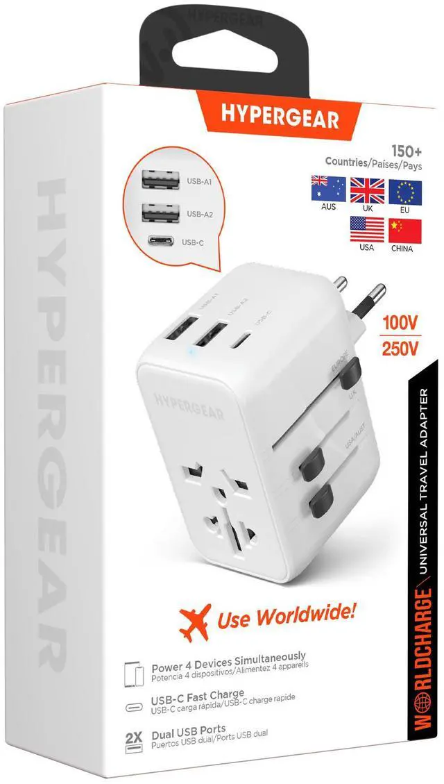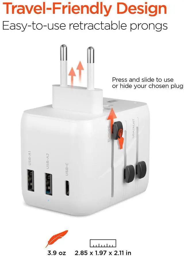 Stay connected no matter where you are! Built to function in more than 150 countries, territories, and island regions, this 4-in-1 travel adapter integrates a 15W USB-C fast charge port, two high-speed USB-A ports, and a versatile AC socket into one compact, lightweight design thats easy to pack. Offering full international voltage compatibility and retractable prongs in 4 configurations, it lets you charge up to 4 devices at once from a single outlet, wherever you go!