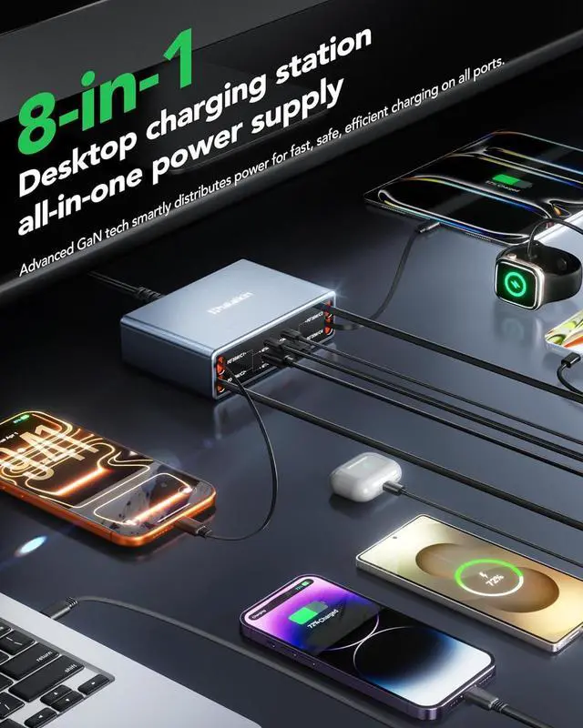 Note: only for MacBook Air series and Galaxy Tab S8 series tablets. [80CM Maximum Retractable Charging Cables] This retractable charger for multiple devices features four 80cm ( 31.5 inch) retractable cord. The retractable phone charger maximum retractable length is 80cm perfect for charging iPhone Android phones or tablets with USB-C ports. Whether used as a docking station on your desk or as a portable extension cord solution this retractable allowing you to charge up to eight devices simultaneously and making it the first choice for multi-device charging[Advanced Gallium Nitride Technology] This iPhone charging station utilizes advanced GaN technology. GaN delivers excellent performance and faster power delivery. This means our USB-C charger can provide up to 105W of total power simultaneously charging your Laptop MacBook Phone Tablet and wireless headphones fully charging in a short time. GaN technology equips this charging station with enhanced safety and high-efficiency charging making it an ideal Desktop companion for home office use. [Charging Station for