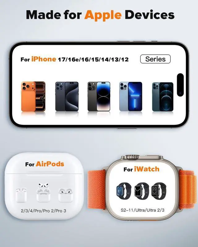 NOTE Your Device Model: For iPhone the magnetic wireless charger stand only supports for iPhone 17/16e/16/15/14/13/12 series and for phone case only supports magnetic case or no case; For watch it is suitable for iWatch11/10/9/8/7/6/5/4/3/2/SE/Ultra/Ultra 2/Ultra 3; For AirPods charging it is suitable for