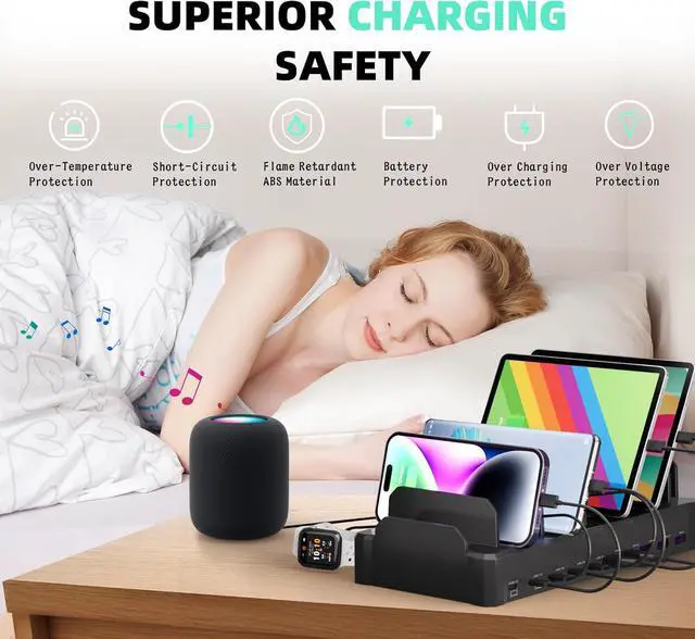 Charging Dock: This multi device charging station equips PD ports for devices to power your smart gadgets with high speed. You can charge your laptops like Macbook series with the top two 20V/ 3.25A fast charging power. Additionally three 45W ports and five 30W ports make it perfect for fast charging iPhones Galaxy S23/Ultra headphones Kindles iWatches Switches and more meeting all your daily charging needs.