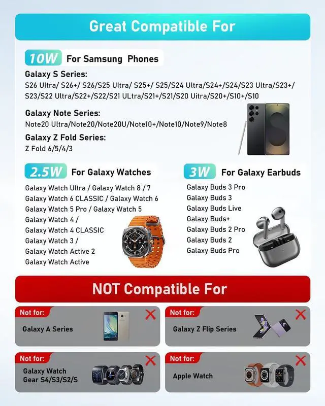 Wide Compatibility: Compatible with most and Android devices that support wireless charging including the Galaxy S Note and Z Fold series Galaxy Watch models and Galaxy Buds earbuds.