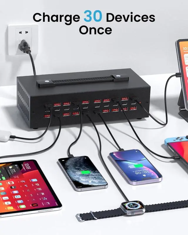 Charging Station: This USB~C fast charging multi-port charger features 10 USB~C ports and 20 USB A ports supporting a total output of up to 250W. Multiple usb charger station effortlessly powers up to 30 devices simultaneously with each port delivering a maximum output of 3A. Perfect for home office and travel.