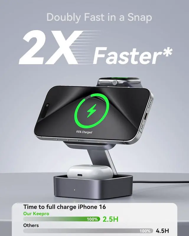 (Note: Please use the included 20W USB-C PD charger and cable for optimal charging. ) Only supports AirPods 4 with Active Noise Cancellation[Wide Compatibility]- The magnetic alignment experience only applies to iPhone Air/17e/17 Pro max/17 Pro/17 Plus/17/16 Pro Max/16 Pro/16 Plus/16/iPhone 15 Pro max/15 Pro/15 Plus/15/iPhone 14 Pro max/14 Pro/14 Plus/14/iPhone 13 Pro max/13 Pro/13 Plus/13/13 mini/iPhone 12 Pro Max/12 Pro/12 Plus/12/12 mini Watch Ultra 3/Ultra 2/Ultra/SE/11/10/9/8/7/6/5/4/3/2/1 & AirPods 4/3/2/Pro/Pro 2/Pro 3 (with MagSafe case). The Charger maintains compatibility with wireless charging so it can be used to charge with any other device that supports wireless charge[Adjustable and Space-Saving]- Featuring a foldable slim space-efficient design with angle-adjustable phone and watch charging modules this magsafe charging station allows you to find any viewing angle you prefer. The compact foldable design also makes it perfect as a travel charger for multiple devices[Multi-Intelligent Protection]- This 3-in-1 charging station provides a safe and secure charging experience with its multi-intelligent protection system. Featuring over-voltage over-current protection and temperature control it safeguards your device's battery health and prevents overheating. Additionally short-circuit protection ensures enhanced safety[What You Get]- KEEPRO Foldable 3 in 1 fast wireless Charging Station 20W USB-C PD charger adapter 3ft (1m) USB-C to USB-C cable and welcome user guide