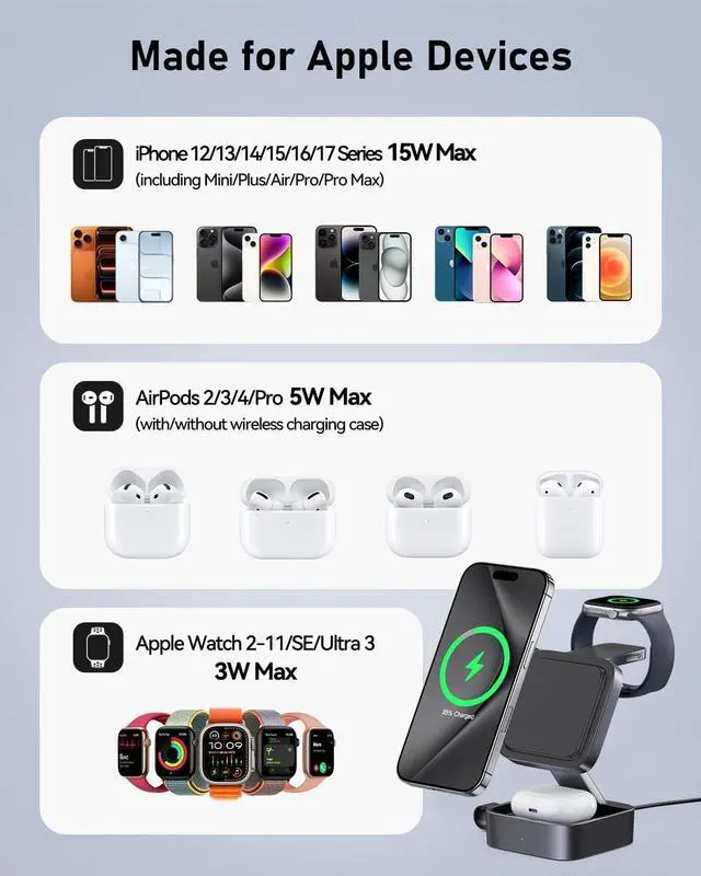 [Fast Charging and Compatible with MagSafe]- Seamlessly compatible with MagSafe fast charge your iPhone with 15W magnetically Watch SE/Ultra 3/Ultra 2/Ultra/11/10/9/8/7/6/5/4/3/2 and 3/2 AirPods 4/3/2 simultaneously.