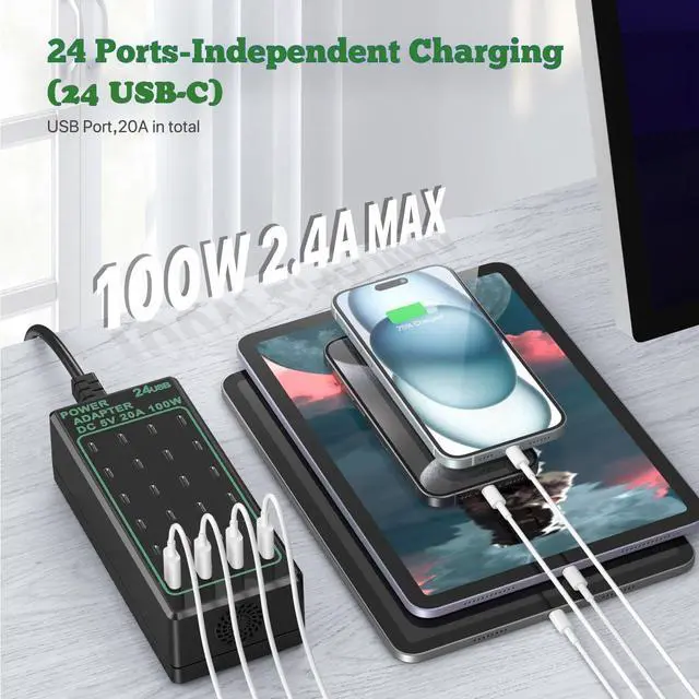 ? 100W 24 USB C Ports Charger The wall mounted hub charger provides 24 USB C ports each port can reach 2.4A or 20A in total with a total power of up to 100W And when you connect multiple devices power will be distributed efficiently between USB C Charge ports to ensure you get the best charge same time and frees you from messy chargers with various interfaces.? Universal Compatibilitys The USB C Power Adapter Plug compatible with All smartphones and tablet devices. compatible with iPhone 15/15 Pro/15 Pro Max/15 plus/14/14 Pro/14 Pro Max/14 Plus/13/13 Pro/13 Pro Max/12/12 Pro/12 Pro Max/12 Mini/11/11 Pro/11 Pro Max/iPhone XS/XS Max/XR.