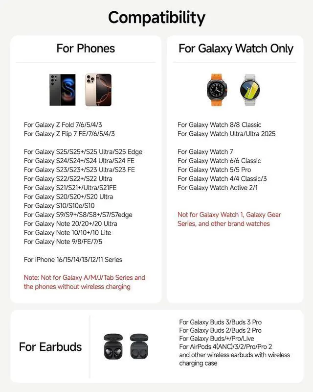 Wireless Charging: The leQuiven Wireless Charging Station combines simplicity and style charging your phone Galaxy Watch and earbuds simultaneously. Eliminate messy cables save space and enjoy efficient convenient chargingCompatibility: The wireless charger is compatible with Galaxy Z Flip7/Galaxy S25 Ultra/S25+/S25/S24 Ultra/S24+/S24/Z Fold6/Z Flip6/S24/S24+/Z Fold5/Z Flip5/S23 Ultra/S23 Plus/S23/S22 Ultra/S22/Z Fold4/Z Flip4/S21 FE/S21 Ultra/S21/S20/S20 Ultra/S10/Note 20/Note10 etc.; only for Galaxy Watch 8 Classic/8/7/Ultra/6/6 Classic/5 Pro/5/4/4 Classic/3/1 Active 2/1; for iPhone 16/15/14/13/12/11 series; for Galaxy Buds3 Pro/3/2 Pro/Live/+ and so onAdjustable
