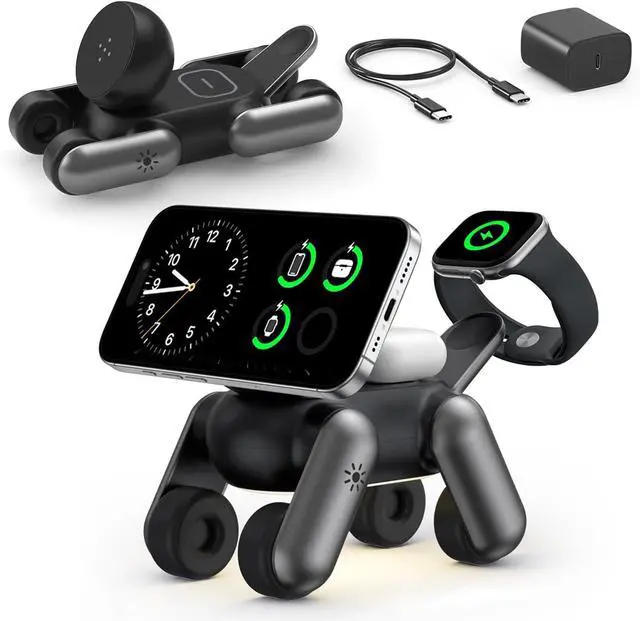 3 in 1 Charging station for DevicesIt's compatible with with MagSafe charger fast charging and designed for charging iPhone watch and Airpods simultaneously. this multiple stand wireless charger suitable for iPhone 17/Air/16/15/14/13/12 series Watch S11/10/9/8/7/6/5/4/3/2/SE/Ultra 3 2 3 2 Airpods 2/3/4 (with wireless charging case). Foldable & Movable DesignThe charging stand is foldable and its legs with wheels can be adjustable and movable. You could mold it into cute poses like standing squatting down or bowing when charging. it is not only a charging station but also a cute ornament Just play with it to relax when you are tired in the office or home.