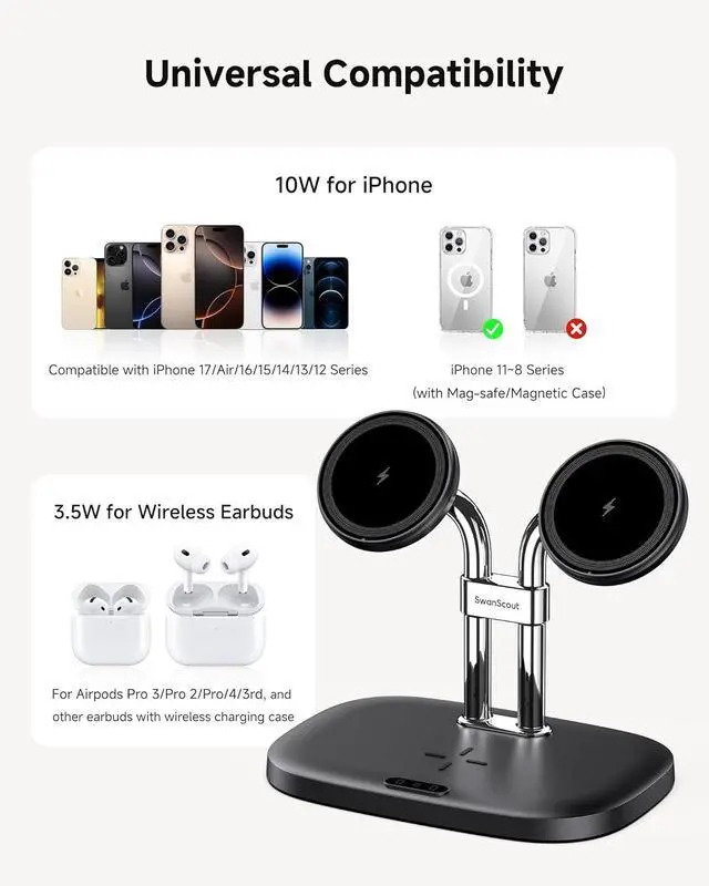Design: The inclusion of a wireless charging pad for Earbuds adds to the convenience. The SwanScout 706M provides a perfect and compact solution for organizing charging space reducing clutterCompatibility: The SwanScout 706M is compatible with iPhone Air/17/16/15/14/13/12 Series and designed for 3/Pro 2/Pro AirPods 4/3. Other compatible devices are listed in the product imagesEfficient