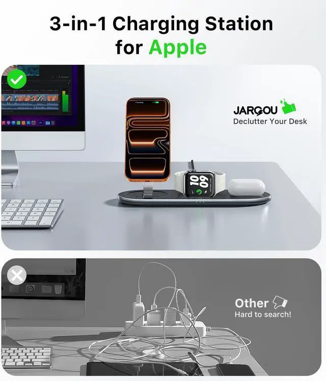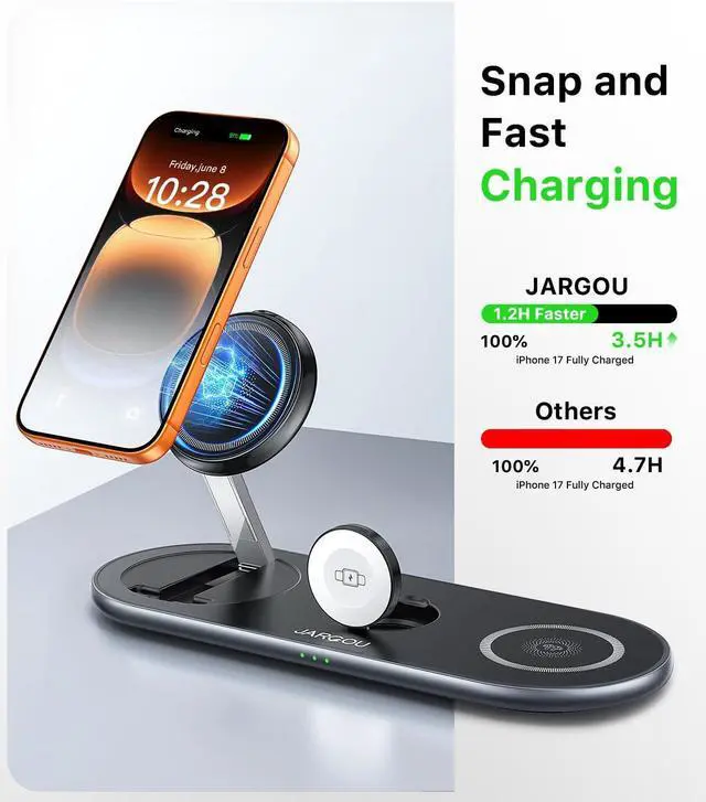 3 in 1 Charging Station for DevicesThis all-in-one fast magnetic wireless charger can power for iPhone for iWatch for AirPods at the same time. JARGOU charging station is compatible with iPhone 17/Air/16e/16/15/14/13/12 series with Watch 11/10/9/8/7//6/5/4/3/2/Ultra/Ultra 2/Ultra 3/SE & with