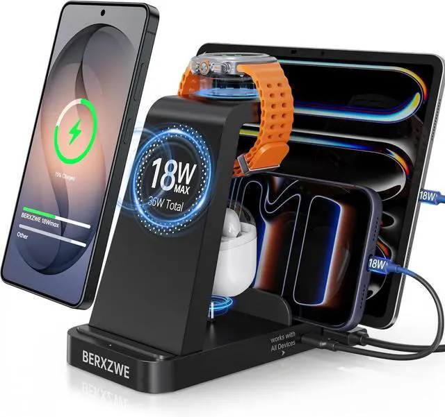 5 in 1 Charging StationBERXZWE 5-in-1 wireless charging station is equipped with a USB C port and USB A port which can simultaneously charge phones Galaxy Watch Galaxy Tab and earphones perfectly solving the problem of charging multiple devices. The portable charging station Makes your home nightstand office desk and meeting room more space-saving and tidy. It is an essential accessory for home office travel and gifts. Fast Charging Station for This wireless charging station is equipped with the latest advanced smart and efficient chipset. 5 in 1 wireless storage charger can charge your 5 devices at the same time improving the efficiency of adapters and sockets overall.