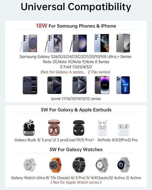 There are 16 ventilation holes and 4 anti-skid pads at the bottom of the Android charging station to dissipate heat and charge your devices safely. Wireless Watch Charger for The watch charger can only charge Galaxy Watch Ultra8/8Classic7/6/6 Classic/5/4/3/Pro/Active. [Not Support for Watch or other brand watch]. If you encounter a situation where the watch cannot be charged you can contact us at anytime and we will provide after-sales service for you. Widly CompatibilityOur charging station works for almost all android and iphone that support wireless charging (NOT FOR Galaxy A and Flip Series). Such as S26 Ultra/S26/S25 Ultra/S25/S24 Ulta/S23/S22/S21/S20/Note20/10/9/8/7 Z Fold 7/6/5/4/3/2 iPhone 16/16e/16 Plus/16 Pro/16 Pro Max/iPhone 15/15 Plus/15 Pro/15 Pro Max/iPhone 14/14 Pro Max/14 Plus/14 Pro/iPhone 13/13 Pro/13 Pro Max/13 Mini/12/12 Pro/12 Pro Max/12 Mini/11/11 Pro/11 Pro Max/SE/XS MAX/X/XR/8/8 PlusSecure Intelligent ProtectionOur desk charging station has passed FCC CE and RoHS certification.