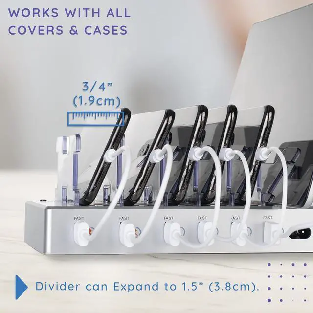 Silver charging station for multiple devices with six USB ports and lightning cables (iOS) compatible with iPhone cell phones smart phones and iPad tablets. Fast and smart charge the 6 port fast charging dock will charge your devices up to 58% faster than other devices offering 2.0 amps or less; the stand recognize your devices and deliver the amp needed. Loved by families and businesses use at home on kitchen counters desks tables or nightstands; excellent fit for schools restaurants hotels courier companies concierge desks libraries and more. The device has light status indicators that turn off when charging is complete.