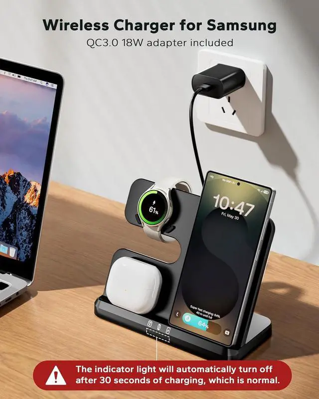Smart Charging LED IndicatorThe 3-in-1 wireless charging station features a smart LED charging indicator. Upon power connection the indicator illuminates for approximately 3s before automatically extinguishing. During charging the devices the green light activates for 30s then shuts off - giving you confirmation without any sleep-disturbing lights throughout the night. Safe and ReliableThe wireless charger stand ensures complete safety with multiple protection systems including overvoltage protection overcharge protection shortcircuit protection overheating protection FOD etc. This charging station brings reliable and worry-free charging for all your devices. What You GetThe package includes Wireless Charging Station QC 3.0 Adapter USB Type A to C Cable User Manuel 24 months warranty and prompt customer service.