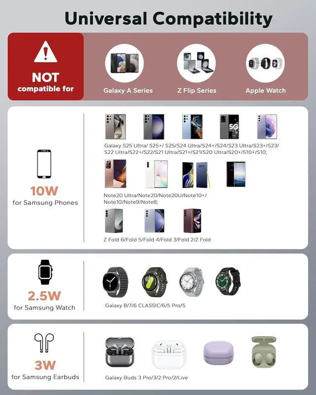 3in1 Charging Station for This 3in1 wireless charging station is universally compatible with devices including Galaxy S26-S10/ Z Fold/ Note20 UItra/Note20/Note10+/Note10/Note9/Note8. watch charger for Galaxy Watch 7/Ultra/6/6 Classic/5 Pro/5 and Galaxy Buds 3/2/Pro. All in one sleek space-saving design. No more tangled cables or multiple adapters cluttering your desk. Compact and SleekThis wireless charging station features a remarkably compact and sturdy design that consolidates your charging into one reliable spot. Its stable non-slip base securely holds your devices preventing slips and falls. Transform a tangled mess of cables into a single neat charging center that keeps your desk organized.