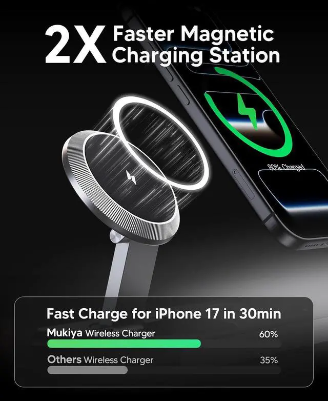 Adjustable Night Light: Charging shouldn't overheat your devices. Built with premium thermal silica gel and an internal cooling pad it effectively disperses heat to protect your phone and watch batteries for lasting performance. The smart multi-protection chip provides reliable defense against over-current over-voltage and short circuits. A built-in 3-level adjustable night light adds soft illumination for your bedtime routine. CE FCC and UL certified for safe quiet and reliable charging all night long.?? Strong Magnetic Charging & Efficient Safety: Built-in premium N52 magnets for a powerful magnetic lockthis magsafe charger stand will auto-align your phone and watch in the perfect charging position firmly. No slipping no misalignmentjust a faster more reliable charger. And with its built-in safety syetem no worries for powering up all your devices safely overnight.?? Foldable & Multi Adujstable Charging AnglesThis foldable 3-in-1 charger is 20% smaller than your iPhone 17 Pro saving valuable space at home or on the go. When folded it takes up minimal space. When unfold it just enjoy it as a versatile charging stand adjust the viewing angle for comfortable video calls or watching show. Its perfect space-saving multi-angle solution for bedside workspace or travel.?? Perfect Gift for Men &Clean Design Ready to GiveThe Mukiya 3-in-1 magnetic wireless charging station is the thoughtful clutter-free gift everyone will appreciatewith its sleek looks and smart function it fits right in on any desk or bedside for a touch of useful style. In the box you'll find the Mukiya 3-in-1 Magnetic Wireless Charging Stand a 20W USB-C Fast Charger a 1.5 m USB-C to C Cable and an Easy Guide. Plus you're covered with our friendly 24/7 support and a worry-free 2-Year Warranty so you can gift with total confidencewe've got your back.