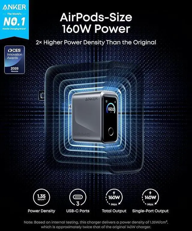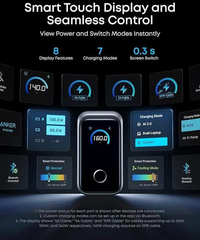 Anker Prime Charger, 160W 3-Port Compact GaN USB C Charger Block, Smart Display and Touch Control, 140W Max Charging via Any Single Port, for MacBook Pro/Air, Laptop, iPhone 17/16 Series(Non-Battery)