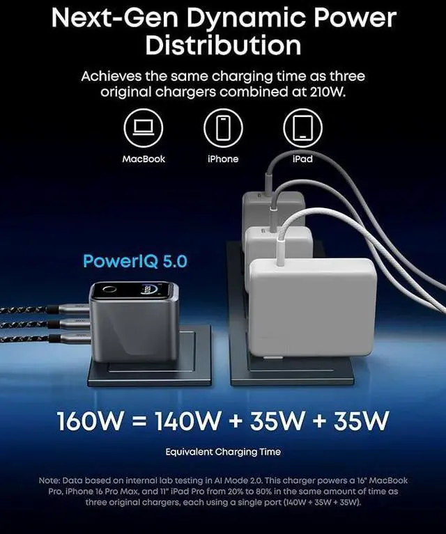 One Equals Three: With smart power distribution powered by PowerIQ 5.0, power a 16" MacBook Pro, iPhone 16 Pro Max, and 11" iPad Pro in the same time as three original chargers (140W + 35W + 35W). Carry one instead of three and stay fully productive on the go.