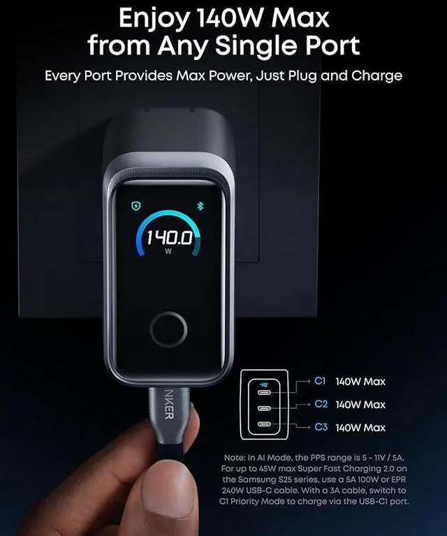140W Single-Port Output: Enjoy a consistent 140W single-port output without derating, keeping laptops charging at maximum speed even during long work sessions or heavy loads. Charge a 16-inch MacBook Pro from 0 to 50% in just 25 minutes, without worrying which port to use.