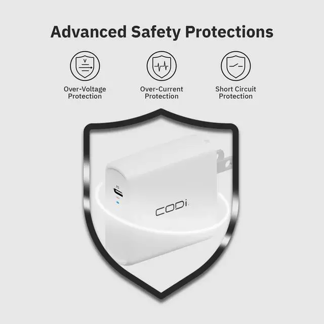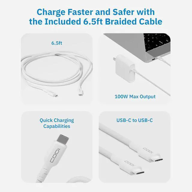 Included with the charger is a durable 6.5-foot USB-C to USB-C braided cable featuring Extended Power Range (EPR) support, enabling safe and consistent high-wattage charging. Built with robust materials and integrated safety protections, the CODi 100W Wall Charger ensures dependable performance while protecting connected devices from over-current, over-voltage, and short-circuit conditions.