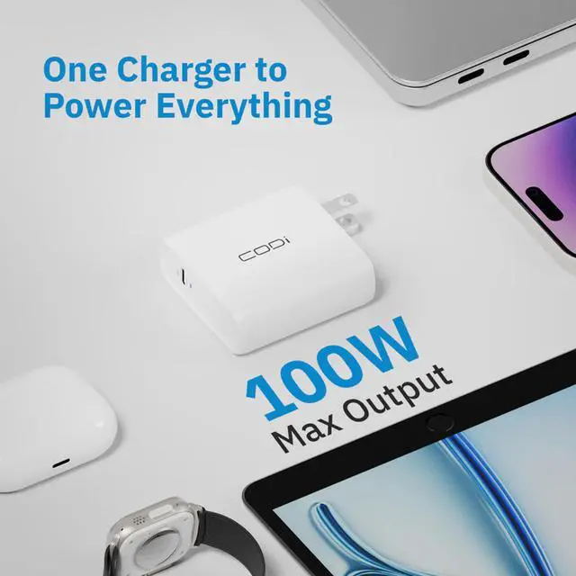 The CODi 100W USB-C Wall Charger delivers high-power, fast, and reliable charging for modern laptops, tablets, and mobile devices. Designed with USB-C Power Delivery technology, this charger provides up to 100W of output to efficiently power compatible high-demand devices while maintaining a compact, streamlined form factor suitable for home, office, or travel use.