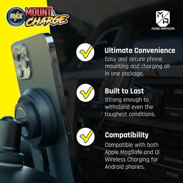 The FLEX Mount and Charge Magnetic Wireless Charging Kit from Mob Armor is a cutting-edge product that provides a one-stop solution to all your phone mounting and charging needs. This amazing bundle is equipped with the strongest magnetic wireless charger- the FLEX Magnetic Wireless Charging system. It provides quick and efficient charging. FLEX Mount and Charge Magnetic Wireless Charging Kit also comes with the all-aluminum MobNetic Maxx, that ensures your phone stays securely in place while you're on the go. Moreover, the kit includes a 38W Dual USB Car Charger that enables you to charge two devices at once. The FLEX Mount and Charge Magnetic Wireless Charging Kit is compatible with both MagSafe and Qi Wireless Charging Android phones, making it an all-in-one solution for charging your phone wherever you go. With easy on-and-off wireless charging and nearly unlimited mounting options, you can charge your device on the go and keep it securely mounted in your car.