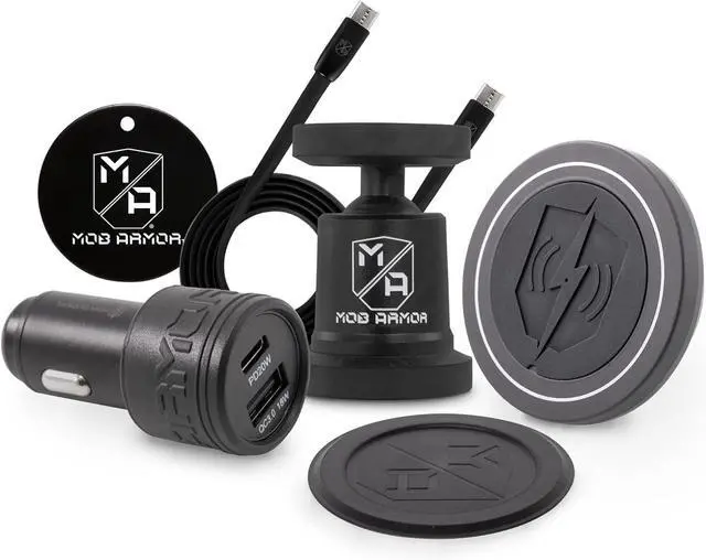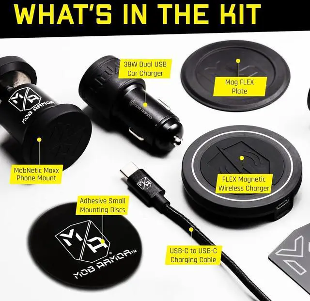 The FLEX Magnetic Wireless Charging system and the MobNetic Maxx with 90lb pull-force magnets keep your device safe and secure from jolts and bumps during magnetic mounting. The FLEX Mount and Charge provides superior phone mounting with its aluminum ball housing and adhesive Mounting Disc, offering unmatched versatility. The all-aluminum MobNetic Maxx is designed for maximum strength, and the FLEX Magnetic Wireless Charger and 38W Dual USB Car Charger are constructed with solid material, providing safe charging for your device and ensuring that the kit will last long beyond your phone.