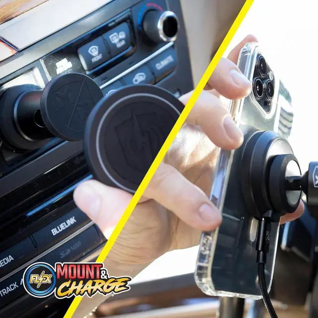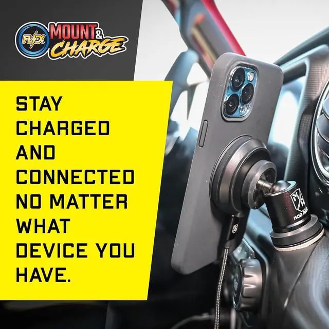 The FLEX Mount and Charge from Mob Armor is the ultimate solution for your phone mounting and charging needs. This innovative product combines the strongest magnetic wireless charger with the toughest phone mount, providing users with a reliable and convenient way to charge their phone while keeping it securely in place. With its aluminum ball housing and adhesive mounting disc, the FLEX Mount and Charge offers unmatched versatility, allowing you to tilt and twist your device to the perfect viewing angle. The all-aluminum MobNetic Maxx phone mount with 90lb pull-force magnets is designed for maximum strength and durability, ensuring that your phone stays in place during even the roughest rides.