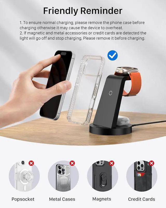You can always trust CORN charger stand that uses globally recognized advanced Qi, CE, RoHS, FOD, and FCC to deliver safe, reliable power. The smart chip provides over-temperature protection, over-power protection, short-circuit protection, Mag-Safe protection, and foreign object detection functions, to ensure the safety of your devices during charging. The LED lights on the charger indicate the charging status while flashing alerts you to any abnormal situations.