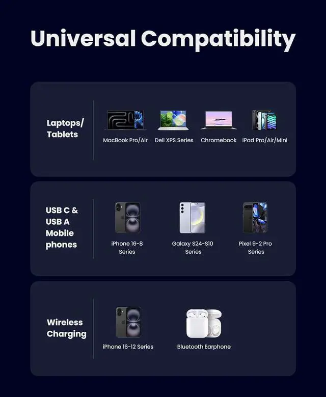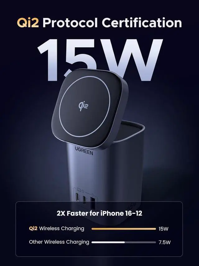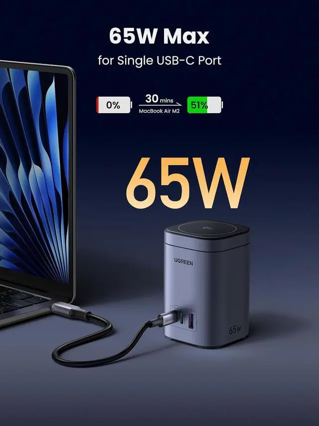 Compatibility: This UGREEN Nexode 65W charging station with 15W wireless charging is compatible with a wide range of devices, including iPhone 16/15/14/13/12, Galaxy S24/S23, iPad Air, MacBook Pro and more