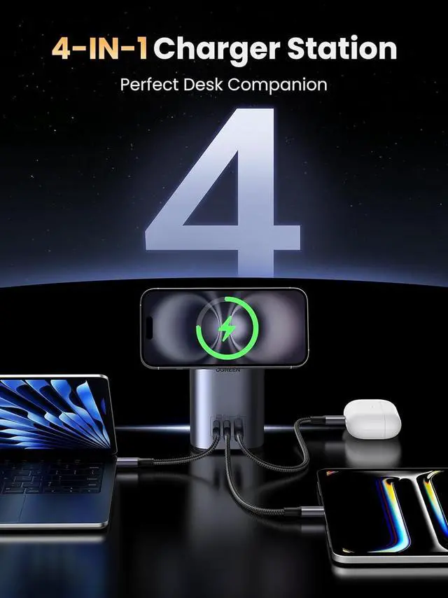 Charging Station: Offering a 15W Qi2 wireless charging stand as well as 2 USB-C ports and 1 USB-A port, this magsafe charging station is now possible to charge up to 4 devices at the same time, saving your space^^GaNFast