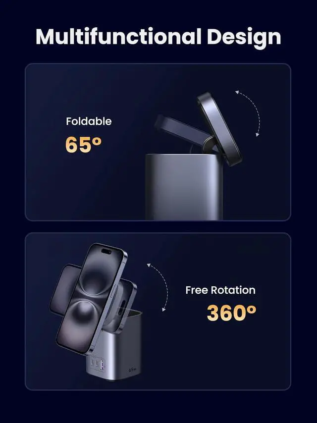Wireless Charging Stand: This 65W charging staion supports 15W ultra-fast wireless charging with Qi2 certification, ensuring safe, fast and efficient charging at all times^^4-in-1