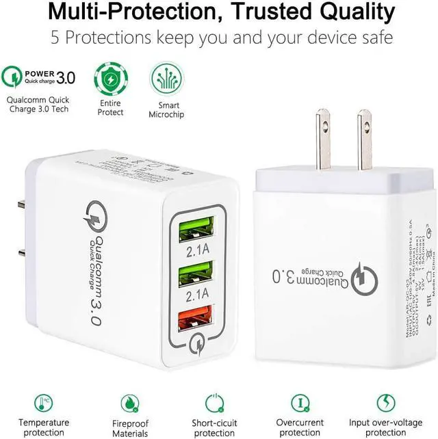One Charger Boosts All 30W Fast Charger with one QC 3.0 and dual 2.1A charging ports, it provides a faster and steady charging speed with wide compatibility for all your devices. Triple usb port enables you to charge 3 devices simultaneous. Smart IC Technology Qualcomm Quick Charge QC 3.0 can automatic recognize any USB Support devices, 4 times faster than normal charger. When the cell phone battery is full, it will automatically stop charging. Save Your Time! Universal and Portable Output DC 5V/ 2.1A ( 10.5W att), Global voltage complatibility with AC100-240V and 50/60 HZ input.